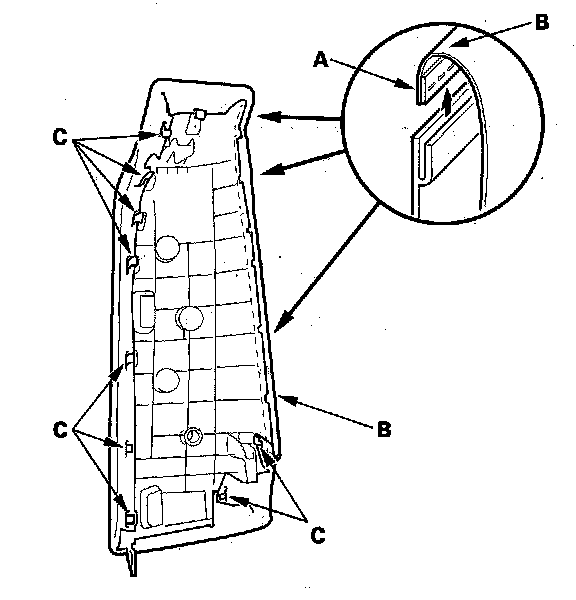 2. Release all the hook strips (A), fold back the seat side bolster cover (B), and release the cover from the hooks (C) to remove it.
