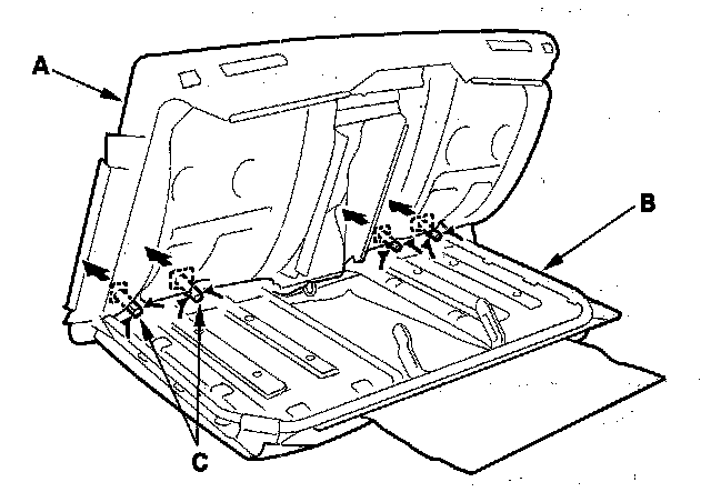 5. Release all the clips (A), and hook strips (B), and fold back the seat-back cover (C).