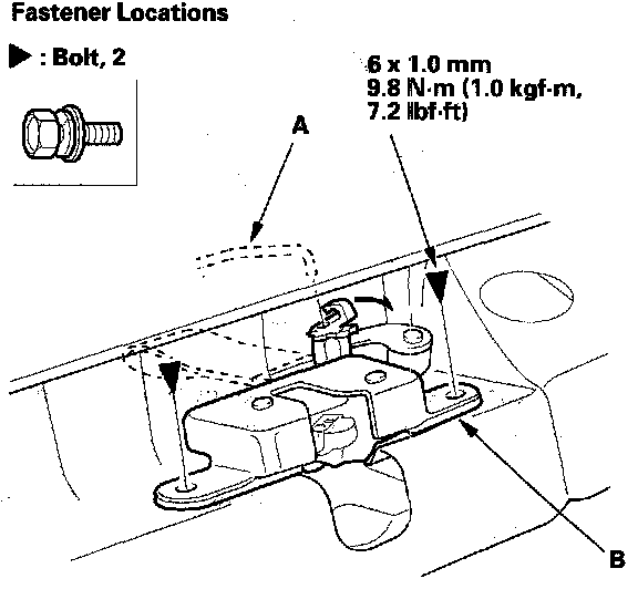 2. Disconnect the cylinder rod (A), remove the bolts, then remove the seat-back latch (B).