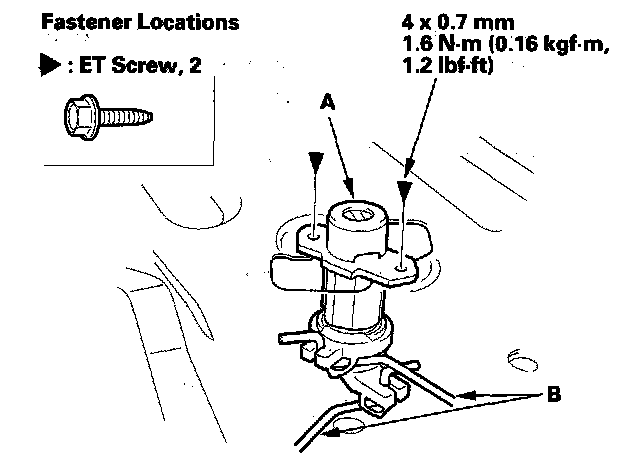 3. Remove the self-tapping ET screws, then remove the seat-back lock cylinder (A) and cylinder rods (B).