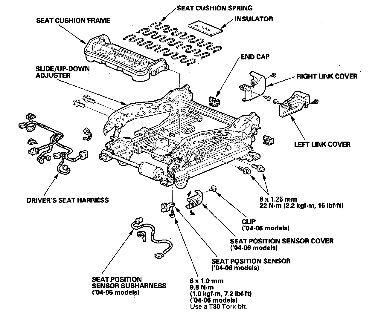 Front Seat Linkage Disassembly/Reassembly 8-Way Power- '04-06 models: The operation of the driver's seat position sensor must be checked after any of these actions: