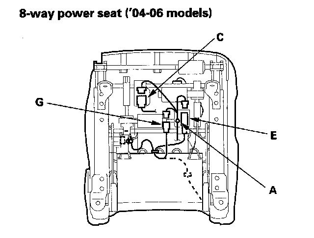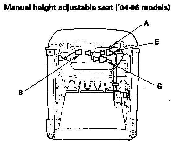- '04-06 models, disconnect the seat position sensor subharness connector (G) on the driver's manual height adjustable seat and the 8-way power seat.