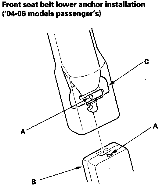 - '04-06 models passenger's seat: The triangle marks (A) on the anchor plate (B) and the lower anchor (C) must face the same side. Insert the anchor plate into the lower anchor, and make sure that it is locked securely.