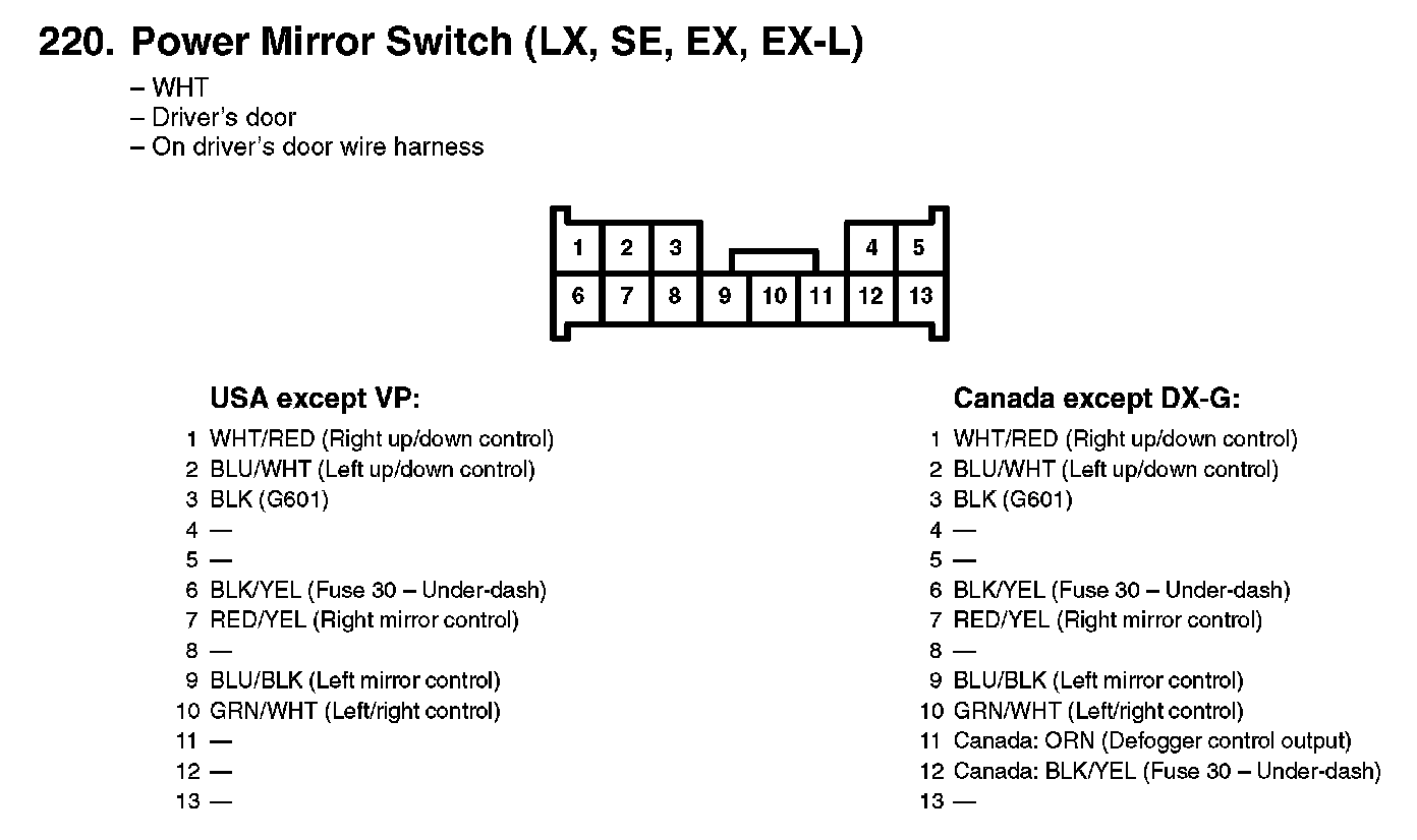 220. Power Mirror Switch (LX, SE, EX, EX-L):