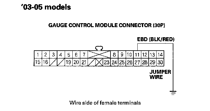 ^ '03-05 models: Connect a jumper wire between the gauge control module connector (30P) terminal No. 11 and body ground.