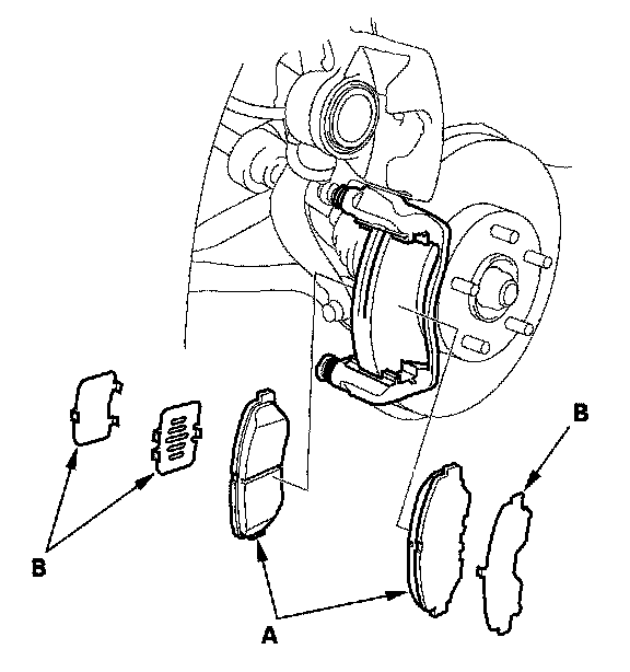 6. Remove the brake pads (A) and the pad shims (B).