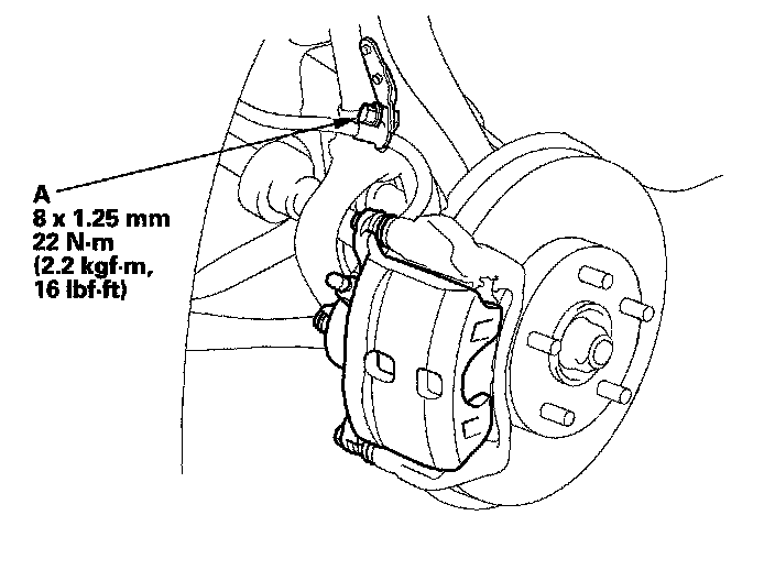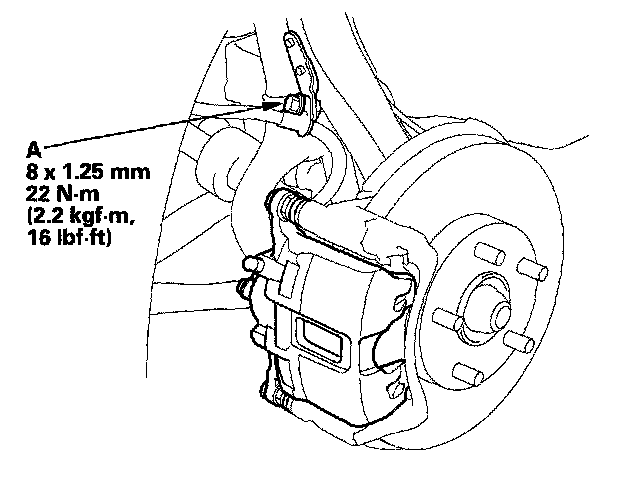 16. Install the brake hose mounting bolt (A), and tighten it to the specified torque.