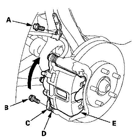 5. Remove the flange bolt (B) while holding the caliper pin (C) with a wrench being careful not to damage the pin boot (D), and pivot the caliper (E) up out of the way. Check the brake hose and pin boots for damage and deterioration.