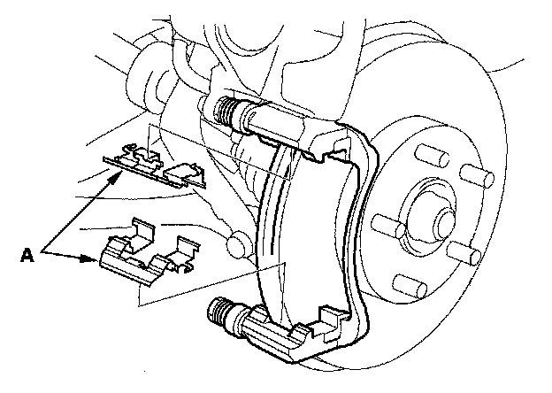 8. Remove the pad retainers (A), and check the caliper pin for free movement.