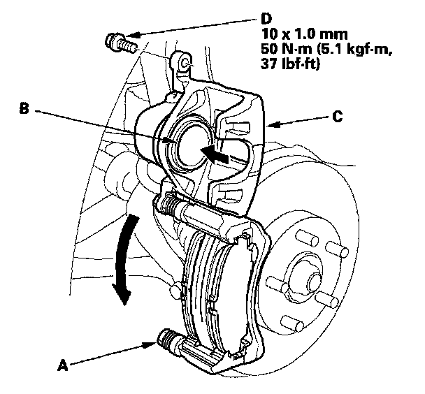 15. Pivot the caliper (C) down into position. Install the flange bolt (D), and tighten it to the specified torque while holding the pin A with a wrench being careful not to damage the pin boot.