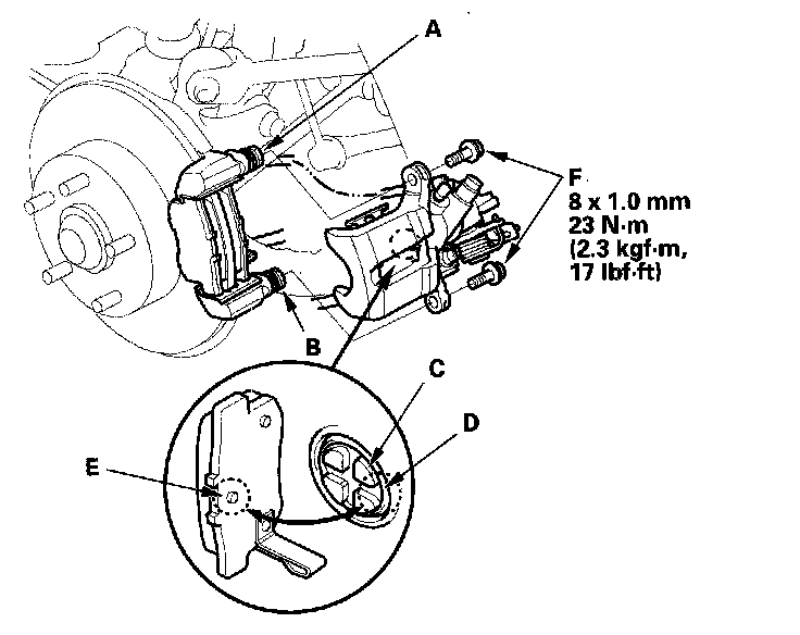 12. Install the caliper. Install the flange bolts (F), and tighten it to the specified torque while holding the pin A and pin B with a wrench. Be careful not to damage the pin boots.