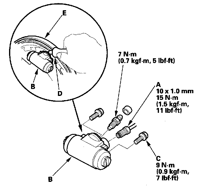 3. Remove the bolt (C) and the wheel cylinder from the backing plate.