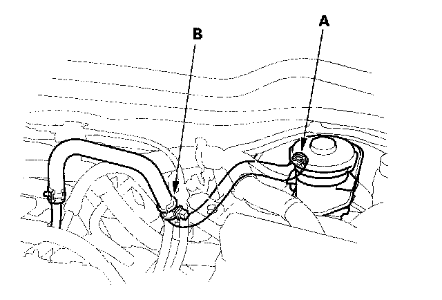 3. Disconnect the brake booster vacuum hose at the booster (A). The check valve (B) is built into the hose.