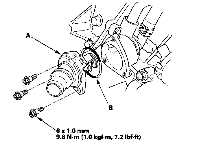 5. Install the thermostat with a new O-ring (B).