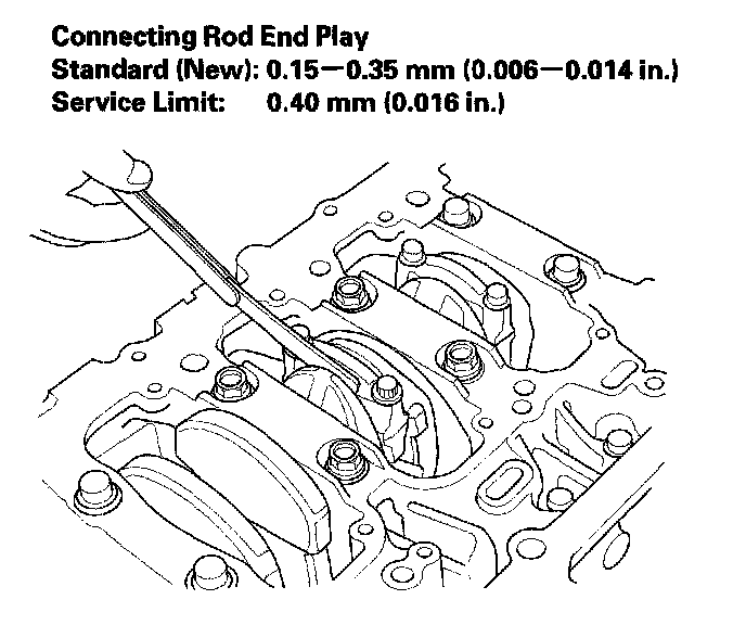 3. Measure the connecting rod end play with a feeler gauge between the connecting rod and crankshaft.