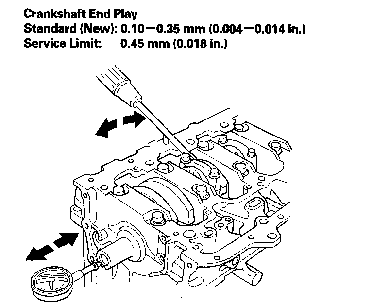 5. Push the crankshaft firmly away from the dial indicator, and zero the dial against the end of the crankshaft. Then pull the crankshaft firmly back toward the indicator; the dial reading should not exceed the service limit.