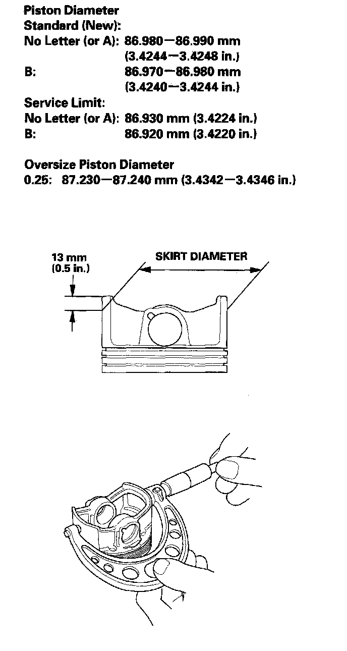 3. Measure the piston diameter at a point 13 mm (0.5 inch) from the bottom of the skirt. There are two standard-size pistons (No Letter or A, and B). The letter is stamped on the top of the piston. Letters are also stamped on the block as cylinder bore sizes.