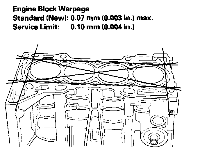 6. Check the top of the block for warpage. Measure along the edges and across the center as shown.
