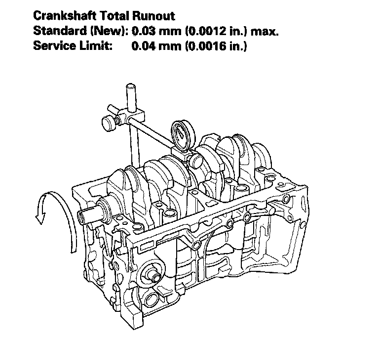 9. Measure the runout on all of the main journals. Rotate the crankshaft two complete revolutions. The difference between measurements on each journal must not be more than the service limit.