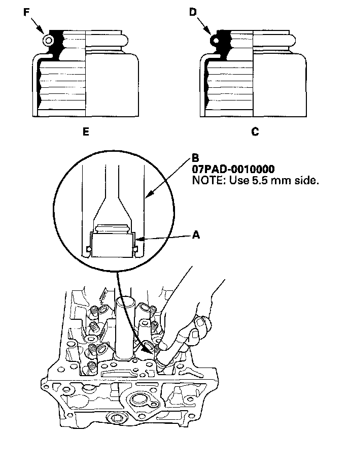 NOTE: The exhaust valve seal (C) has a black spring (D), and the intake valve seal (E) has a white spring (F). They are not interchangeable.