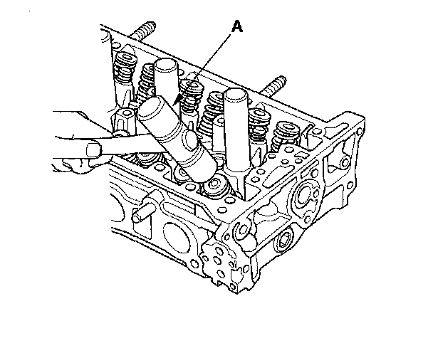 8. Lightly tap the end of each valve stem two or three times with a plastic mallet (A) to ensure proper seating of the valve and valve cotters. Tap the valve stem only along its axis so you do not bend the stem.