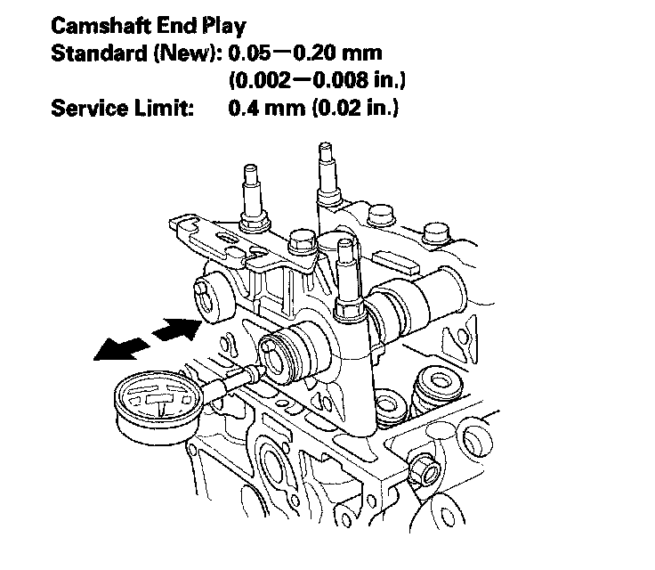 4. Zero the dial indicator against the end of the camshaft, then push the camshaft back and forth and read the end play. If the end play is beyond the service limit, replace the cylinder head and recheck. If it is still beyond the service limit, replace the camshaft.
