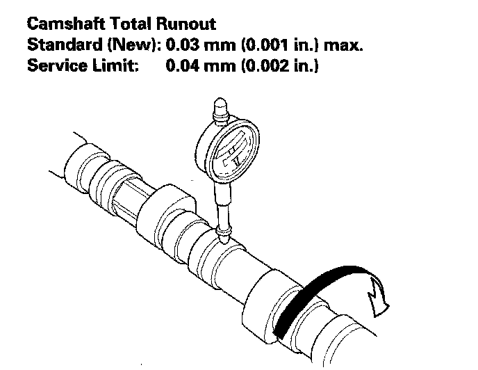 ^ If the total runout is beyond the service limit, replace the camshaft and recheck the camshaft-to-holder oil clearance. If the oil clearance is still beyond the service limit, replace the cylinder head.