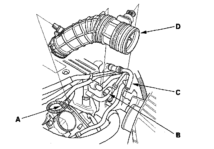 2. Remove the vacuum hose (B) and breather pipe (C), then remove the intake air duct (D).