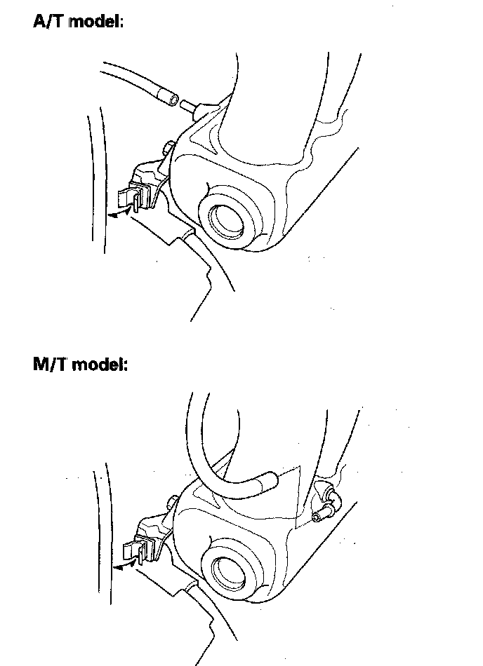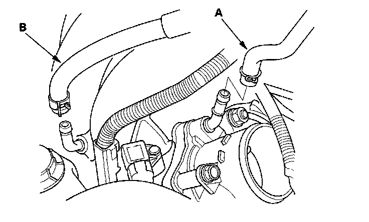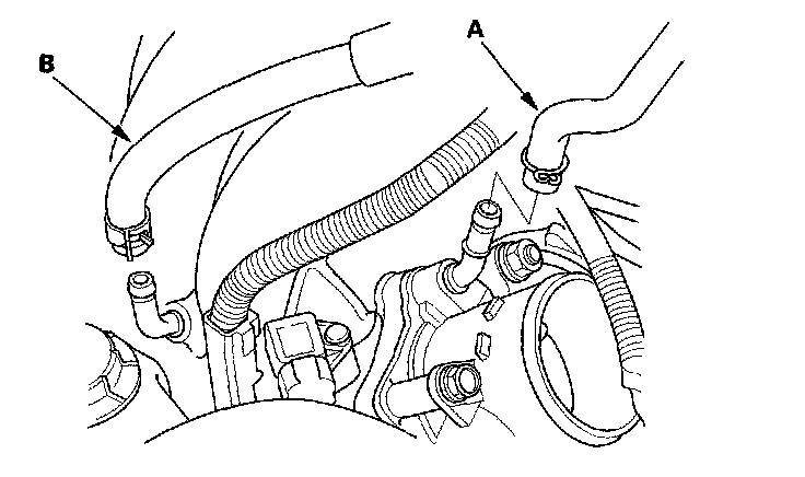 7. Install the EVAP canister hose (A) and brake booster vacuum hose (B).