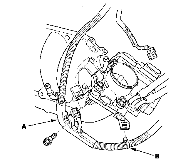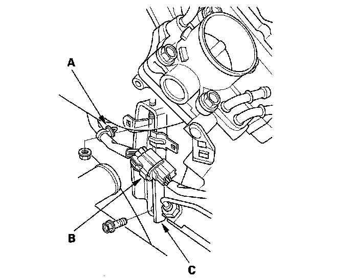 8. Remove the harness clamp (A) and the harness connector (B) from the intake manifold bracket, then remove the intake manifold bracket (C).