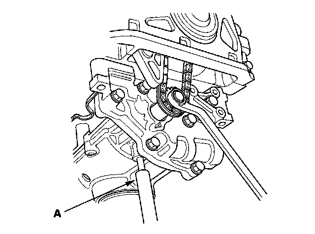 4. To hold the rear balancer shaft, insert a 6 mm pin driver (A) into the maintenance hole in the lower balancer shaft holder and through the rear balancer shaft.
