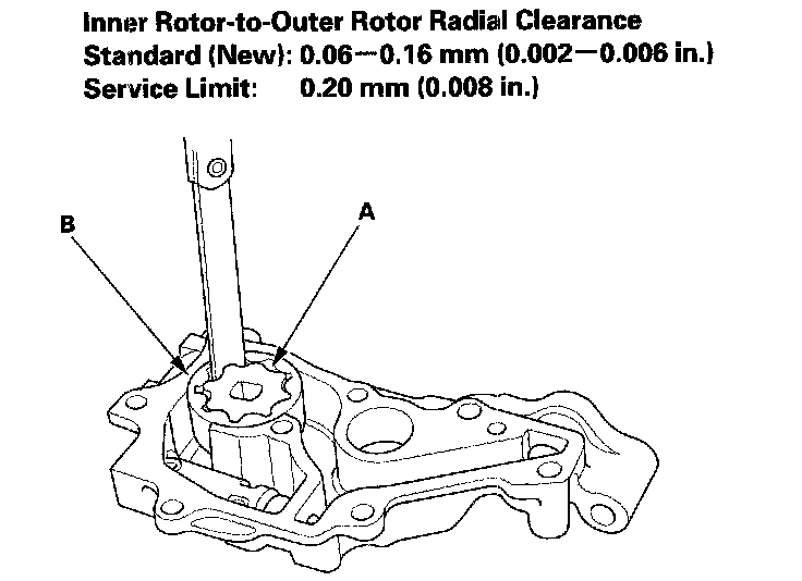 2. Check the inner-to-outer rotor radial clearance between the inner rotor (A) and outer rotor (B). If the inner-to-outer rotor radial clearance exceeds the service limit, replace the oil pump.