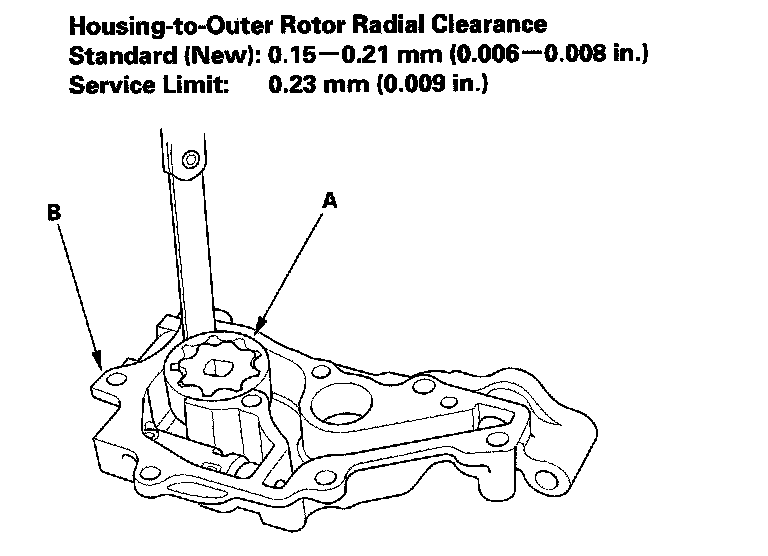 4. Check the housing-to-outer rotor radial clearance between the outer rotor (A) and pump housing (B). If the housing-to-outer rotor radial clearance exceeds the service limit, replace the oil pump.