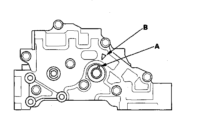 3. Check the housing-to-rotor axial clearance between the rotor (A) and pump housing (B). If the housing-to-rotor axial clearance exceeds the service limit, replace the oil pump.