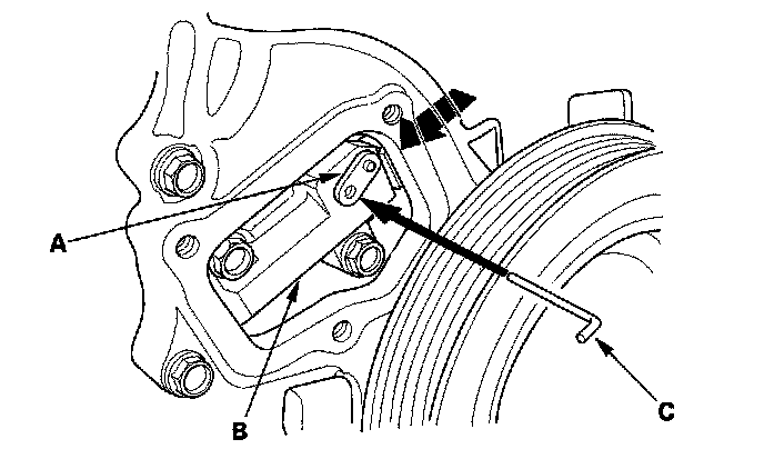 3. Align the holes on the lock (A) and the auto-tensioner (B), then insert a 1.2 mm (0.05 inch) diameter pin or lock pin (P/N 14511-PNA-003) (C) into the holes. Turn the crankshaft clockwise to secure the pin.