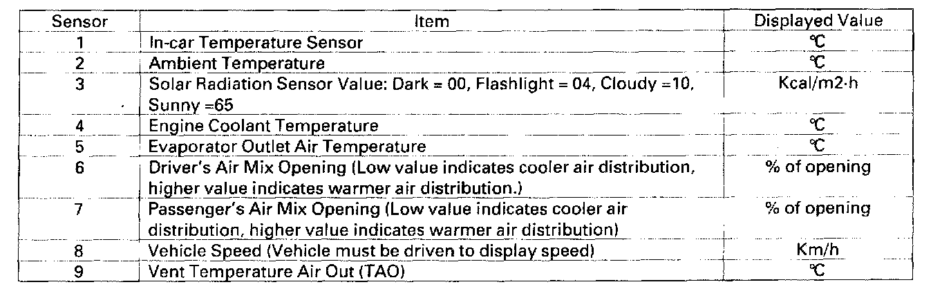 Displaying Sensor Inputs at the Climate Control UnitThe climate control unit has a mode that displays sensor inputs it receives. This mode shows you what the climate control unit is receiving from each of the sensors, one at a time, and it can help you determine if a sensor is faulty.