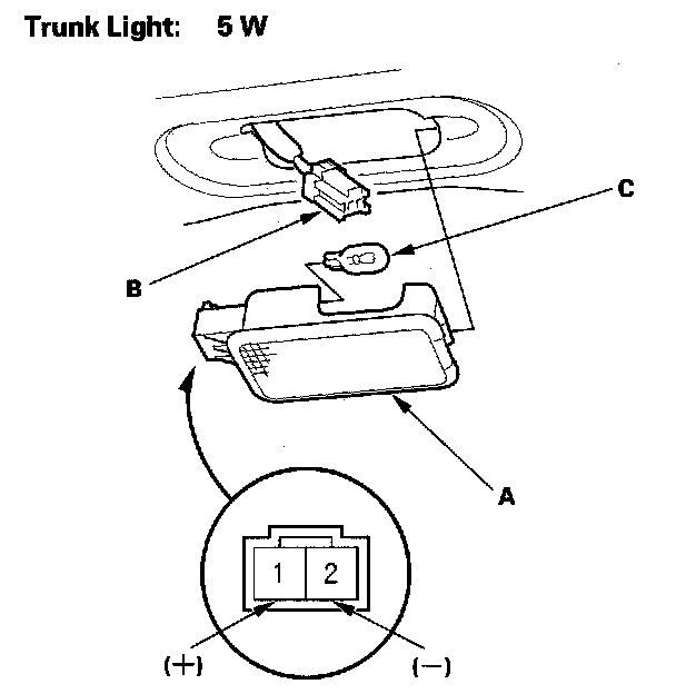 4. Check for continuity between the No. 1 (+) and No. 2 (-) terminals. There should be continuity. If there is no continuity, check the bulb (C). If the bulb(s) is OK, replace the trunk light.