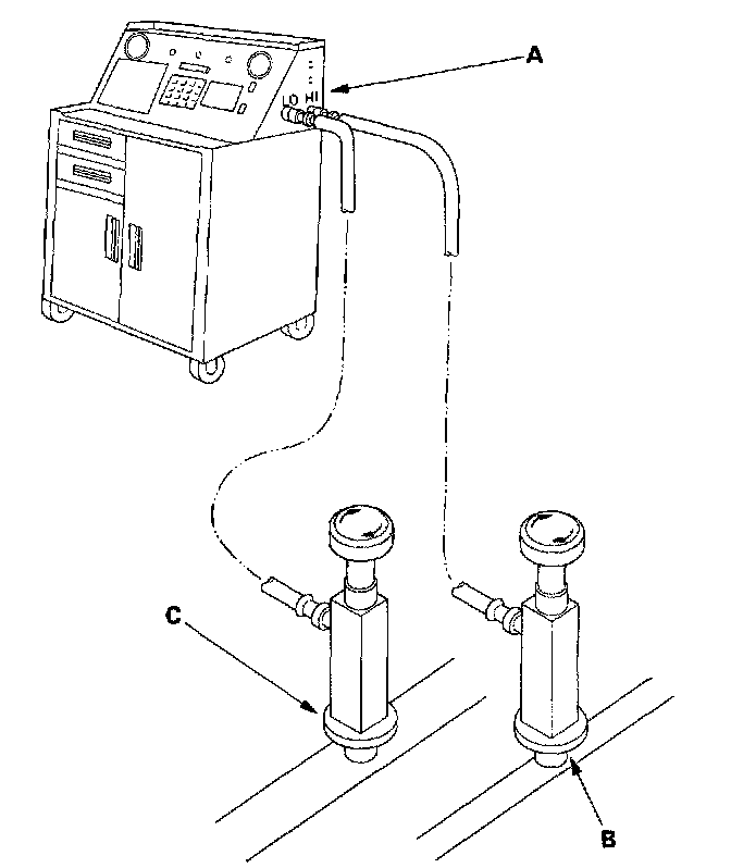 1. Connect a R-134a refrigerant recovery/recycling/charging station (A) to the high-pressure service port (B) and the low-pressure service port (C), as shown, following the equipment manufacturer's instructions.