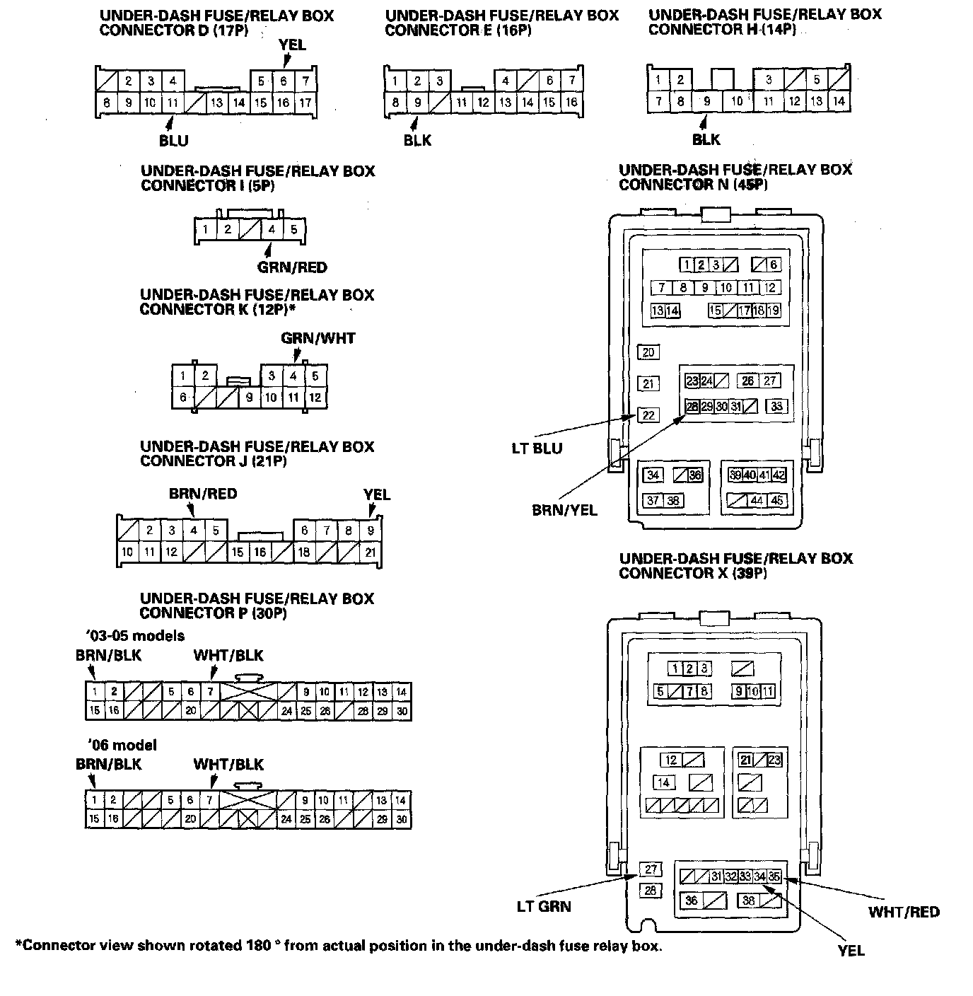 2. Disconnect the under-dash fuse/relay box connectors D, E, H, I, J, K, N, P and X.
