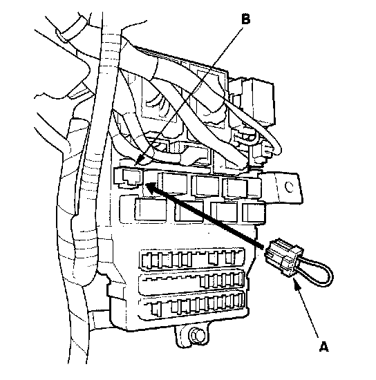 4. Connect the MPCS Service connector (A) to the MCIC socket (B) in the under-dash fuse/relay box.