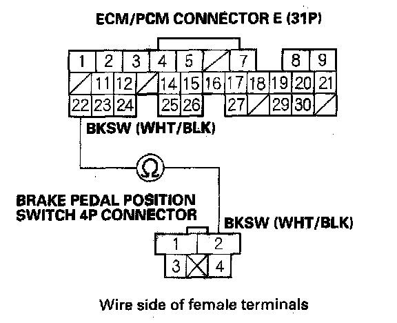 9. Check for continuity between ECM/PCM connector terminal E22 and brake pedal position switch 4P connector terminal No. 2.