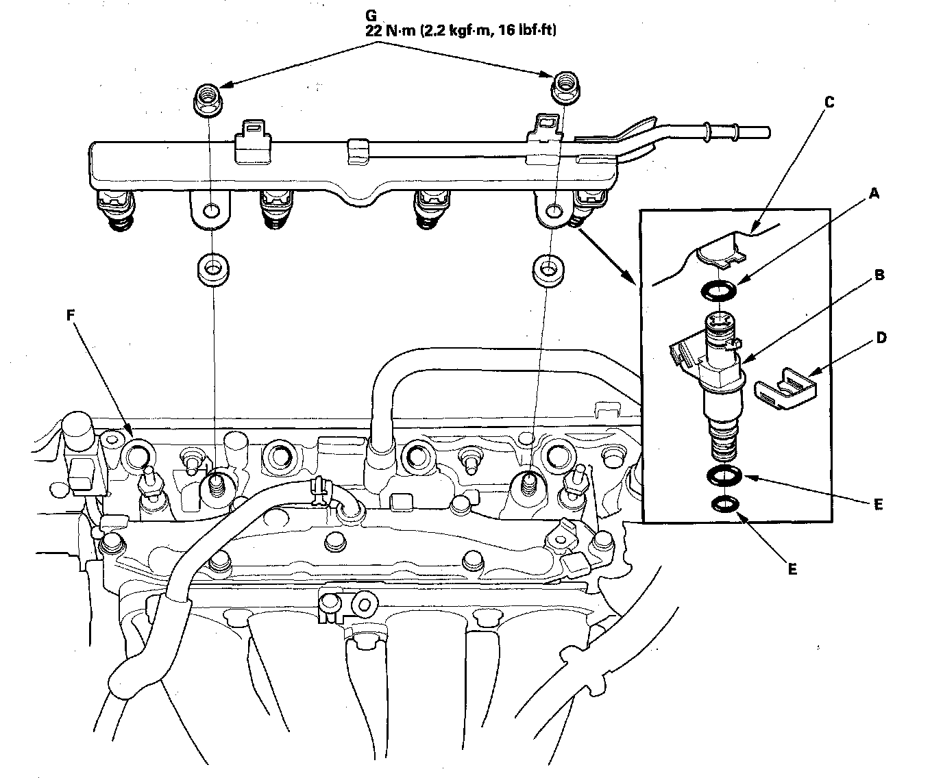 6. Remove the fuel rail mounting nuts (E) from the fuel rail (F).