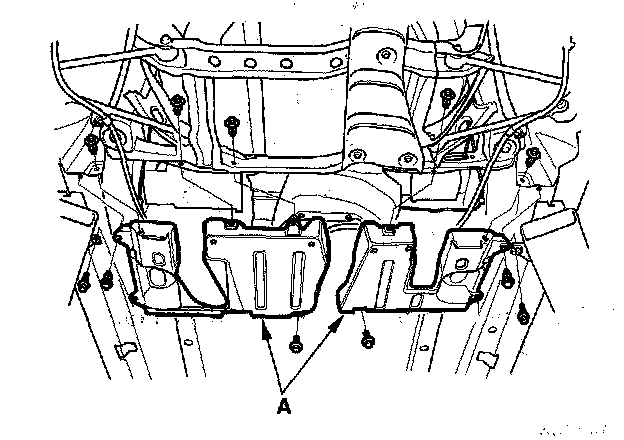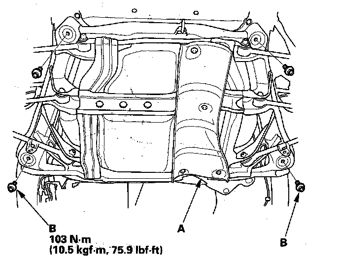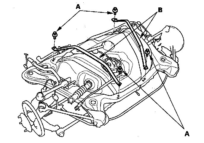 19. Remove the heat shield (A). Place a jack or support under the suspension subframe. Remove the mounting bolts (B). Remove the rear suspension subframe.