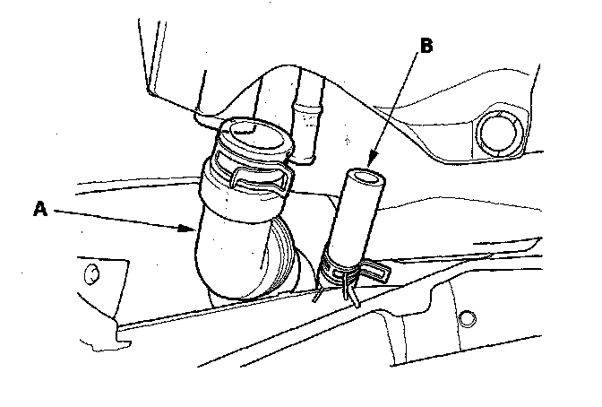 Disconnect the fuel fill neck tube (A) and breather hose (B).