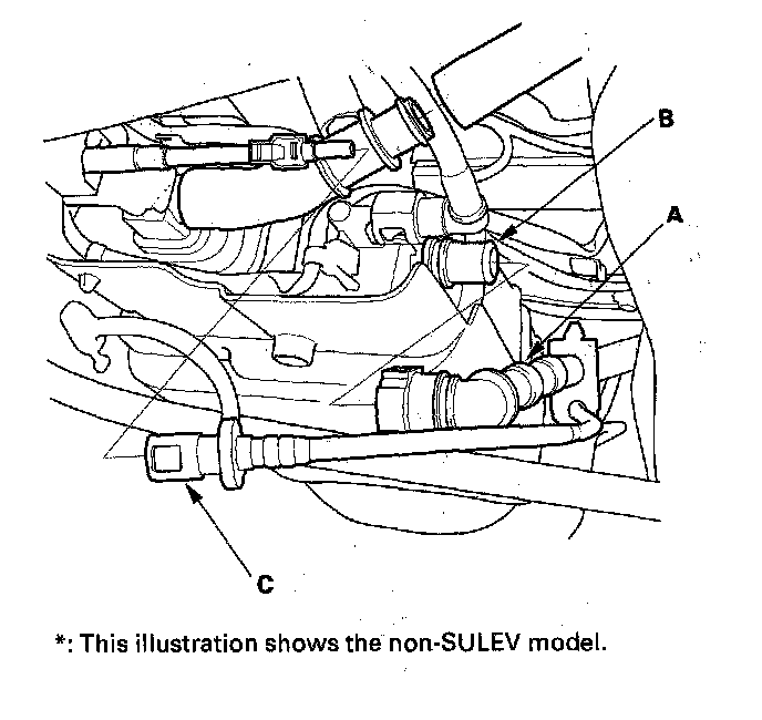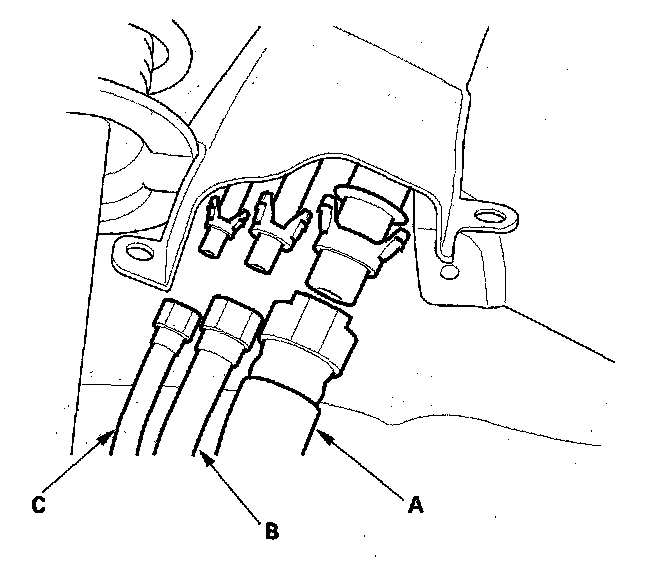 Disconnect the fuel fill neck tube (A), fuel tank vapor recirculation tube (B), and fuel tank vapor signal tube (C).
