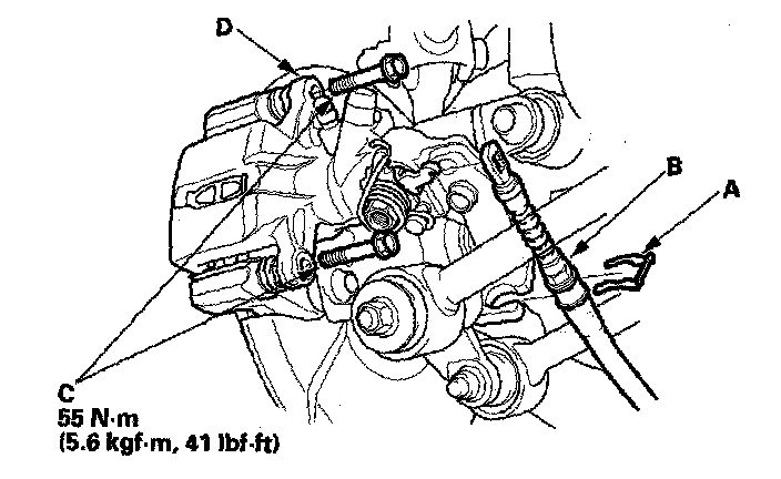 11. If the vehicle has rear drum brakes, go to step 14. If it has rear disc brakes, remove the clip (A), parking brake cable (B), two caliper bolts (C), and caliper body (D).
