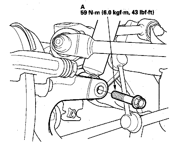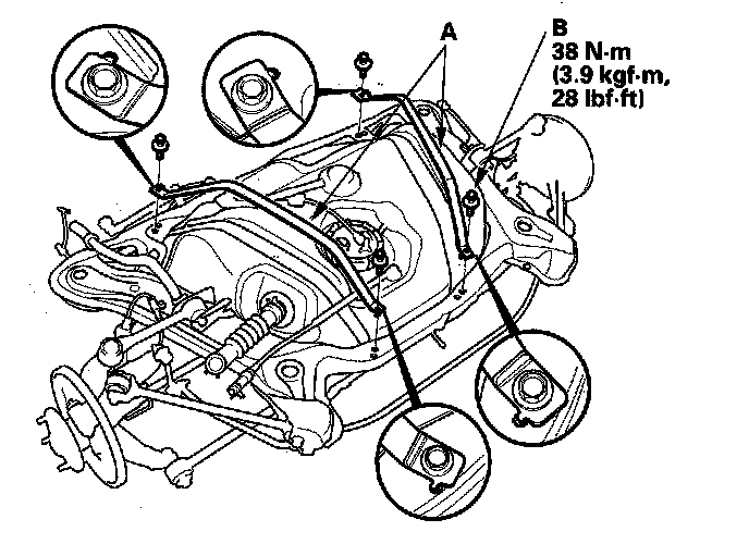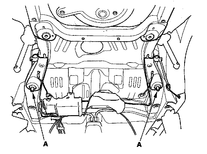 2. Place a jack or support under the rear suspension subframe. Install the rear suspension subframe, aligning the pins (A) with the holes in the rear suspension subframe.