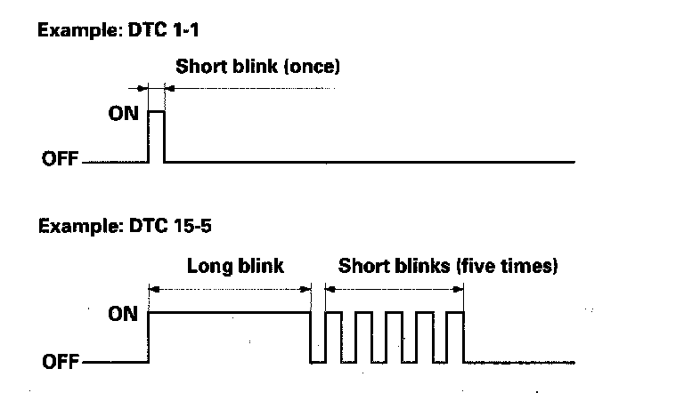 2. Turn the ignition switch ON (II), select SCS mode, then observe the D indicator in the gauge assembly. Codes 1 through 9 are indicated by individual short blinks. Code 10 and above are indicated by a series of long and short blinks. One long blink equals 10 short blinks. Add the long and short blinks together to determine the code.