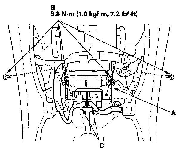 1. Install the new SRS unit (A) with Torx bolts (B). Then connect the connectors (C) to the SRS unit; push them into position until they click.
