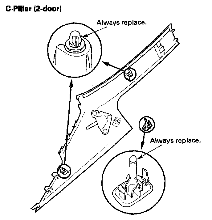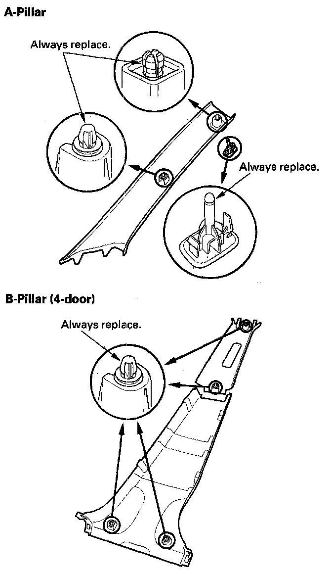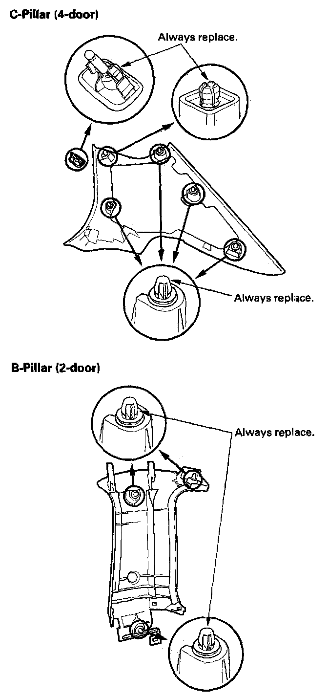 After a collision, where a side curtain airbag has deployed, replace all trim clips on that side, even if they appear to be undamaged. Replace the clips on these parts: